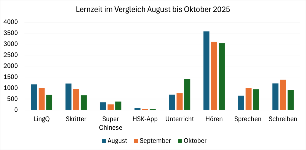 So lag mein Lernpensum im Oktober erneut niedriger als im September, aber weiterhin fast doppelt so hoch wie noch im Juli. Mein Vorhaben, jeden Monat mindestens 100 Stunden Chinesisch zu lernen, konnte ich auch im Oktober mit fast 135 Stunden deutlich erfüllen. Während ich beim Hören und Sprechen das Zeitinvestment halten konnte, gab es vor allem beim Schreiben und Lesen kleine Einbußen, wobei ich insbesondere beim Schreiben sagen würde, dass die Übungsqualität besser wurde, da ich gezielter an meinen Schwächen arbeite.