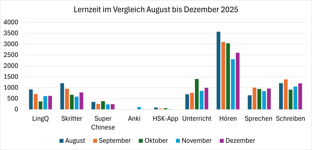 Letztlich mündete dies sogar darin, im Dezember fast wieder das Lernniveau aus dem Oktober erreicht zu haben. Insgesamt wurden es 7.427 Minuten, wobei ich insbesondere beim Schreiben mehr Zeit als in den beiden Vormonaten investierte. Vorsichtig geschätzt (mir fehlt die klare Dokumentation bis 06/2025) müsste ich damit bislang knapp 1.300 (mal mehr, mal weniger produktive) Stunden ins Chinesischlernen investiert haben.